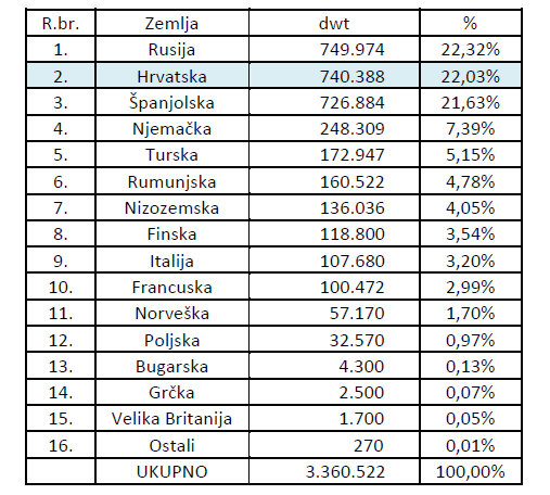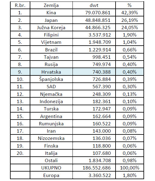U Svjetskoj knjizi narudžbi (mjereno u cGT), Uljanik Grupa (Uljanik Brodogradilište, 3.Maj Brodogradilište) je na 53. mjestu, a pojedinačno Uljanik Brodogradilište na 74. mjestu, 3.Maj Brodogradilište na 95. mjestu, Brodosplit na 108. mjestu, te Brodotrogir na 123. mjestu od 150 najvećih svjetskih brodogradilišta.