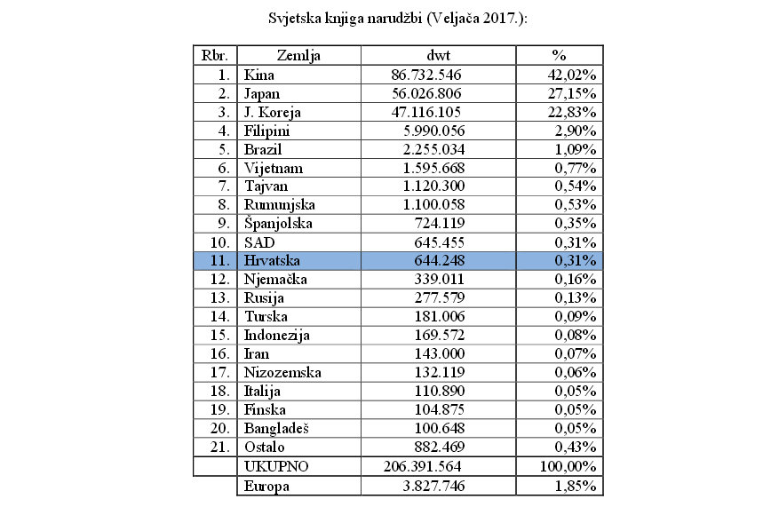 Iz podataka o aktualnoj Svjetskoj Knjizi narudžbi (mjereno u tonama nosivosti), vodeća svjetska brodograđevna zemlja je Kina s oko 42% Knjige narudžbi, a slijede je Japan s oko 27% i J. Koreja s oko 23%. Cijela europska brodograđevna industrija drži oko 1,9% Svjetske Knjige narudžbi, dok Hrvatska drži 11. poziciju s 0,31%.